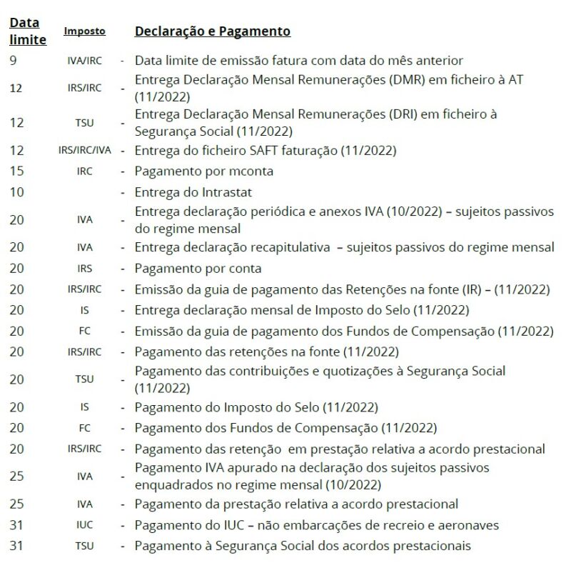 Calendário Fiscal de Dezembro de 2022