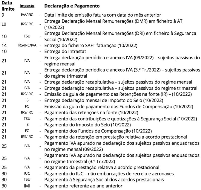 Calendário Fiscal de Novembro de 2022
